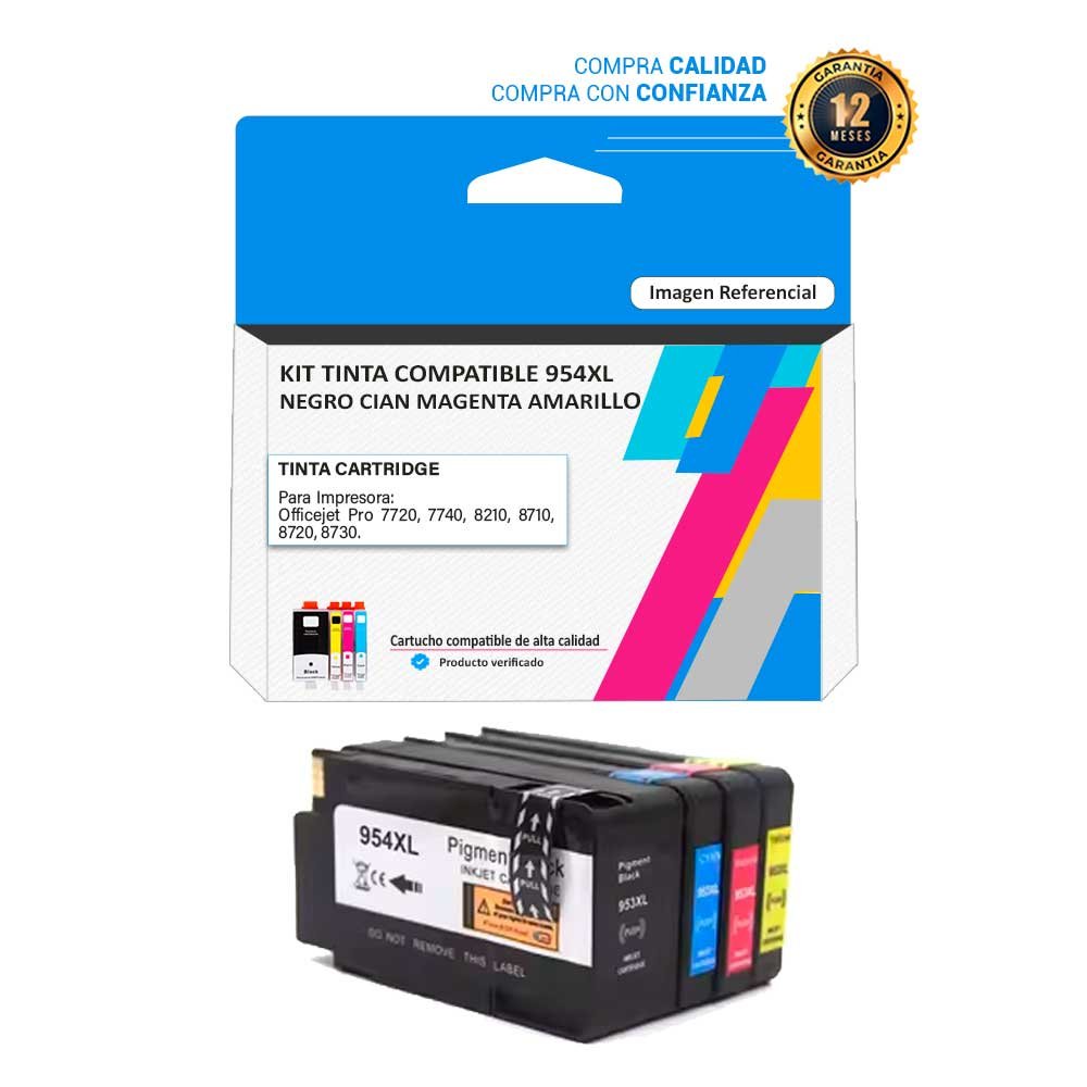 Kit Tinta Compatible HP 954XL para impresoras 7720 7740 8210 8710 8720 8730. Rendimiento Negro 2,000 Páginas y Color 1,600 Páginas. Envío seguro a nivel nacional.