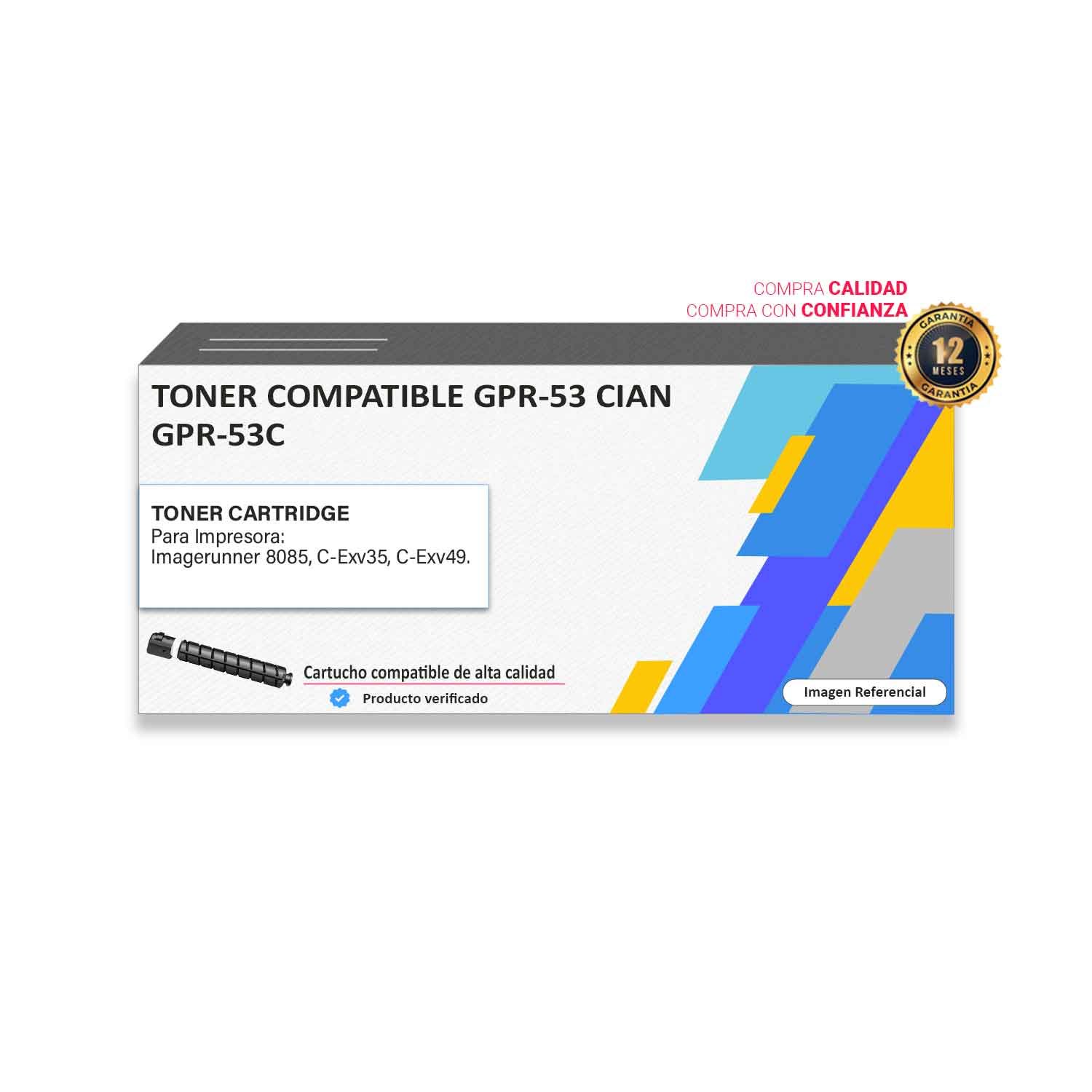 Tóner compatible Canon GPR-53 Cian para impresoras 8085, C-Exv35, C-Exv49. Rendimiento 19.000 paginas. Envíos a nivel nacional al por mayor y menor.