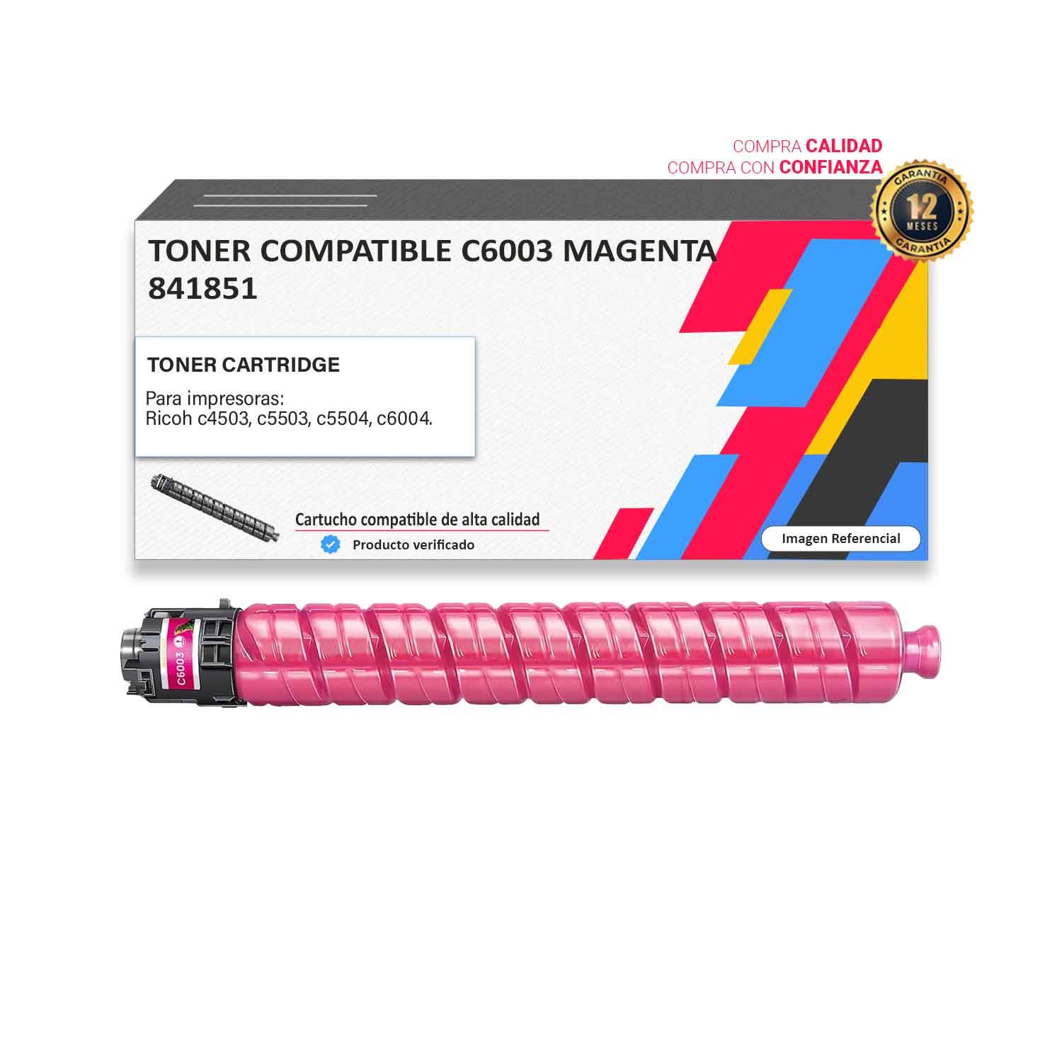 Tóner compatible Ricoh MP C6003 Magenta para impresoras 4503 5503 5504 6004. Rendimiento 22500 paginas. Envíos a nivel nacional al por mayor y menor. Envió seguro.